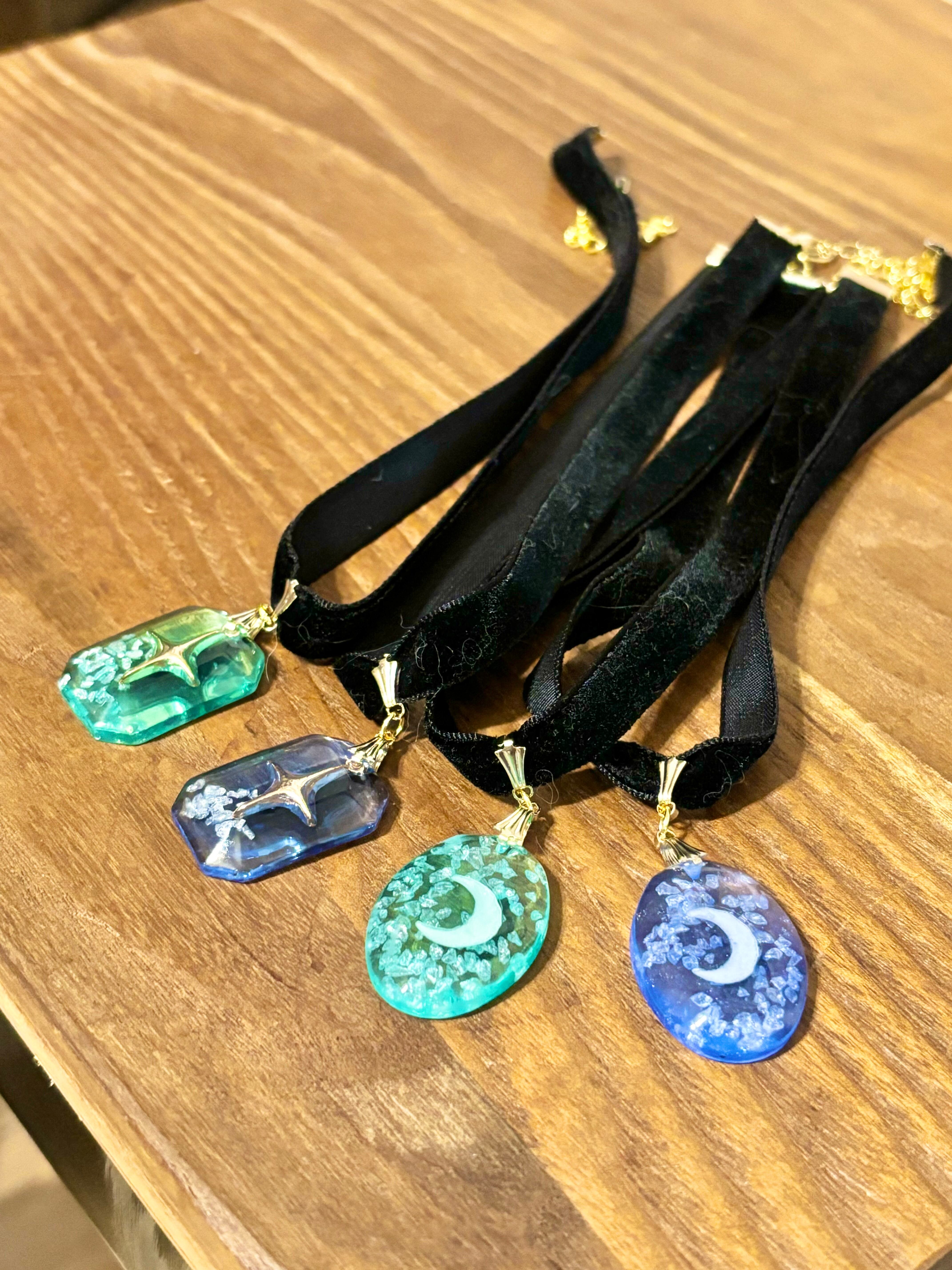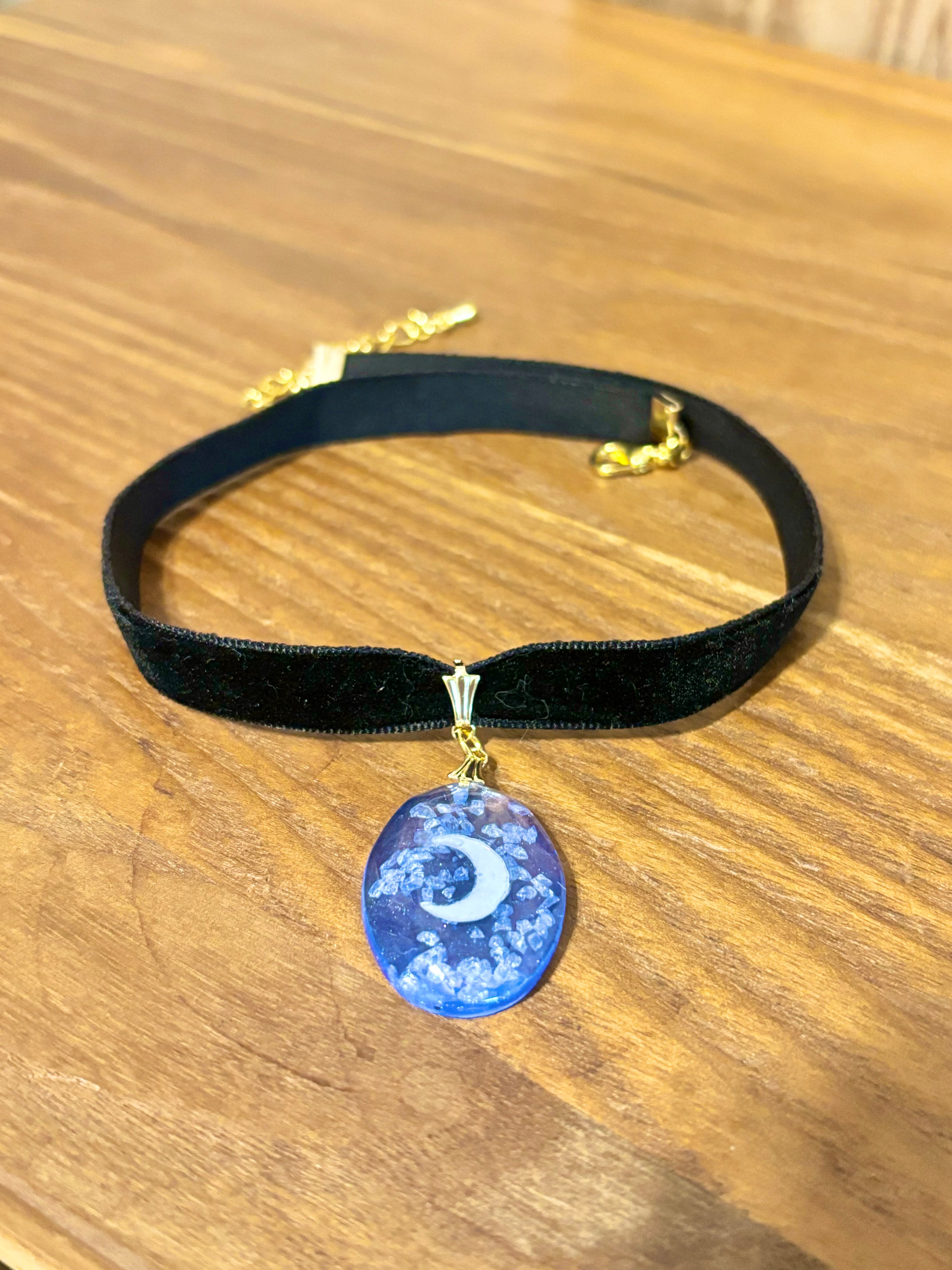常夜の国の月石さんに、ブラックのベルベットリボンを合わせたチョーカーをご用意しました。